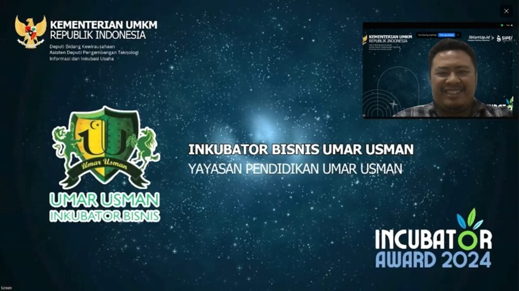 Pada akhir November, Kementerian UMKM RI menggelar acara Inkubator Award secara daring. Acara ini bertujuan mengumumkan hasil pemeringkatan lembaga inkubator bisnis yang telah melalui proses seleksi sepanjang tahun 2024. Dari total 559 lembaga inkubator yang terdaftar, Inkubator Bisnis Umar Usman menjadi salah satu dari 28 inkubator yang berhasil mendapatkan Peringkat A.