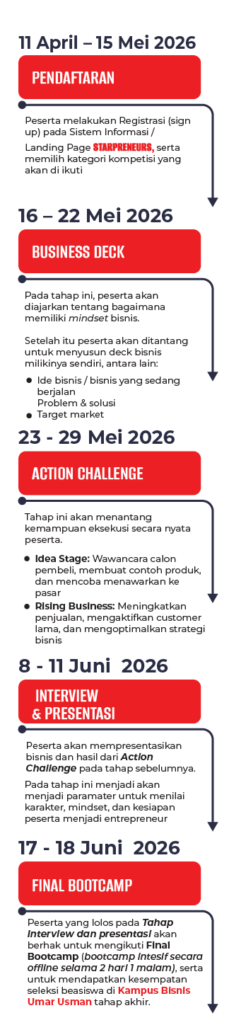 STARPRENEURS juga merupakan bagian dari rangkaian proses Seleksi Beasiswa Pendidikan Program Bisnis Intensif selama 1 tahun (One Year Program) di Kampus Bisnis Umar Usman—sebuah program yang dirancang untuk membentuk pengusaha muda yang tangguh, berintegritas, dan mampu menciptakan dampak nyata bagi masyarakat.